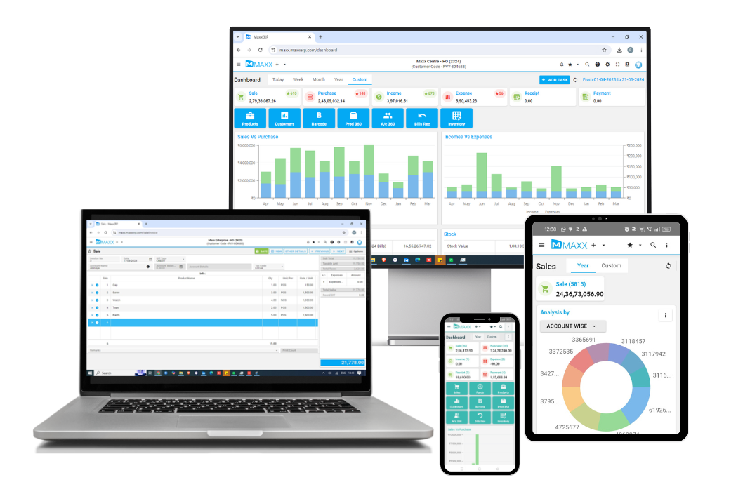 MaxxERP allows centralized control of billing, stock, and pricing across all outlets. You can monitor sales, track store-wise performance, and generate consolidated reports in real time.
